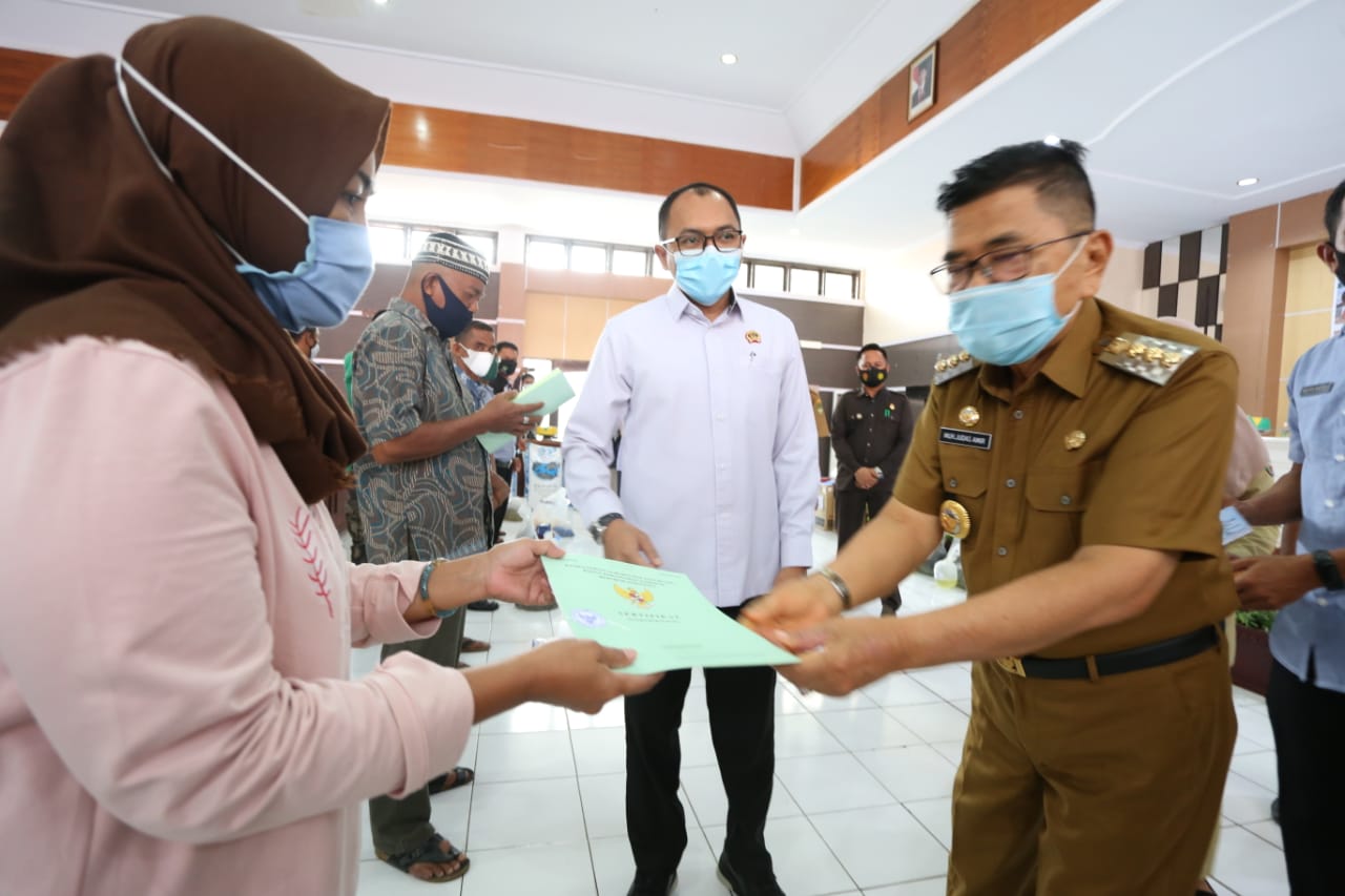 MEDU-ONLINE.PALOPO — Walikota Palopo, Drs. H.M. Judas Amir, MH menyerahkan secara simbolis bantuan sarana dan prasarana perikanan dan sertifikat hak atas tanah nelayan kepada masyarakat nelayan dan pembudidaya tahun 2020.