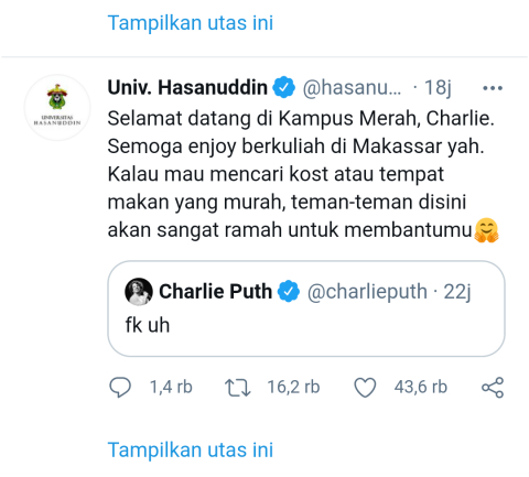 “Selamat datang di Kampus Merah, Charlie. Semoga enjoy berkuliah di Makassar yah. Kalau mau mencari kost atau tempat makan yang murah, teman-teman disini akan sangat ramah untuk membantumu,” tulis akun @hasanuddin_univ, Selasa.