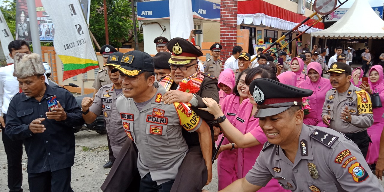 Kapolres Luwu Utara, AKBP Boy FS Samola melepas anggotanya yang sudah purna tugas dengan menggendongnya.