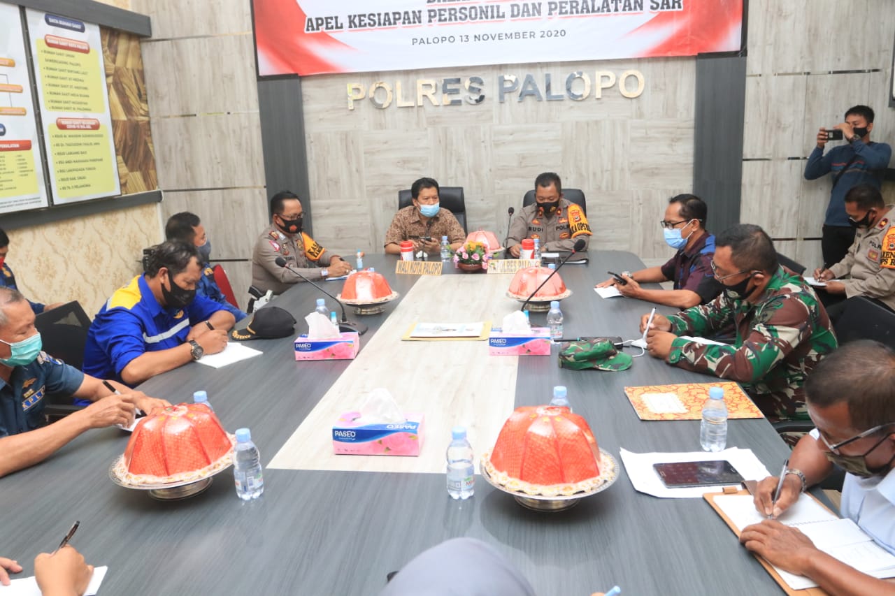 MEDU-ONLINE.PALOPO — Kepolisian Resor Palopo menggelar rapat koordinasi bersama instansi terkait dalam rangka apel kesiapan personil dan peralatan SAR di ruang data Polres Palopo, Jumat, 13 November 2020.