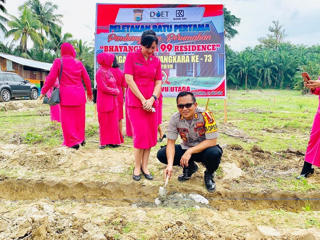 LUWU UTARA — Kapolres Luwu Utara didampingi Ketua Bhayangkari cabang Luwu Utara letakkan batu pertama pembangunan rumah bersubsidi Bhayangkara 99 residence di Desa Baebunta, Kecamatan Baebunta, Kabupaten Luwu Utara, Senin (1/7/2019).