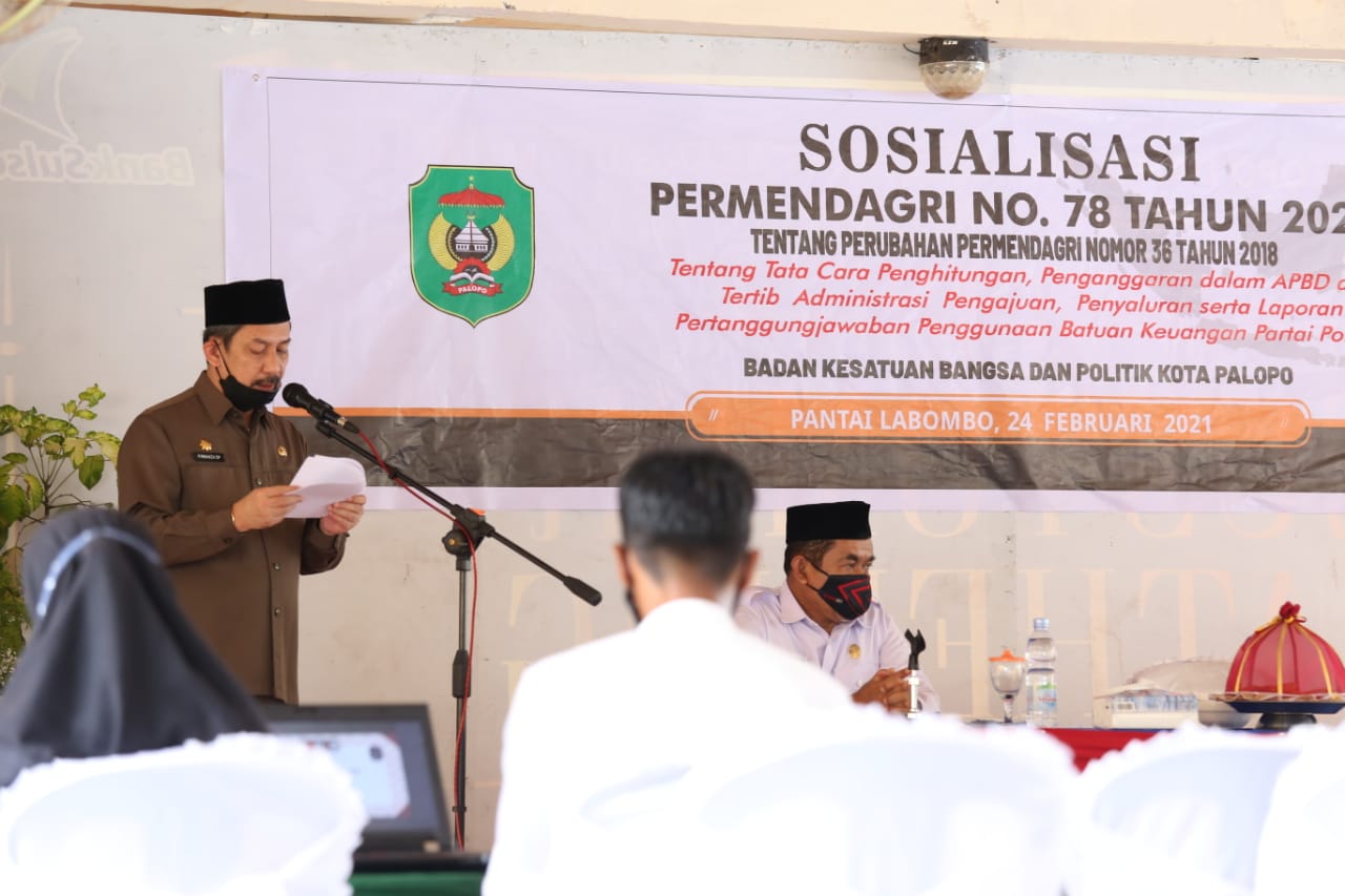 MEDU-ONLINE.PALOPO — Pemerintah Kota Palopo Melalui Badan Kesatuan Bangsa dan Politik Kota Palopo Menggelar Sosialisasi Permendagri Nomor 78 Tahun 2020 Tentang Perubahan Atas Permendagri Nomor 36 Tahun 2018 Tentang Tata Cara Penghitungan, Penganggaran dalam APBD dan tertib Administrasi Pengajuan, Penyaluran Serta Laporan Pertanggung jawaban Penggunaan Bantuan Keuangan Partai Politik, yang dilaksanakan di Pantai Labombo Kota Palopo, Rabu (24/2/2021)