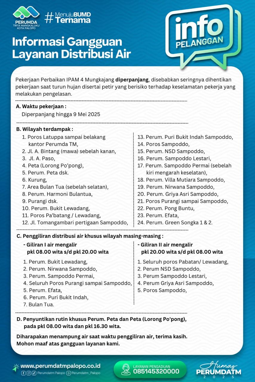 Perumda TM Palopo mengimbau masyarakat terdampak untuk menampung air pada saat giliran distribusi berlangsung. “Kami mohon maaf atas ketidaknyamanan ini. Semoga perbaikan bisa segera rampung dan layanan distribusi air kembali normal,” demikian keterangan resmi Perumda TM. (md)