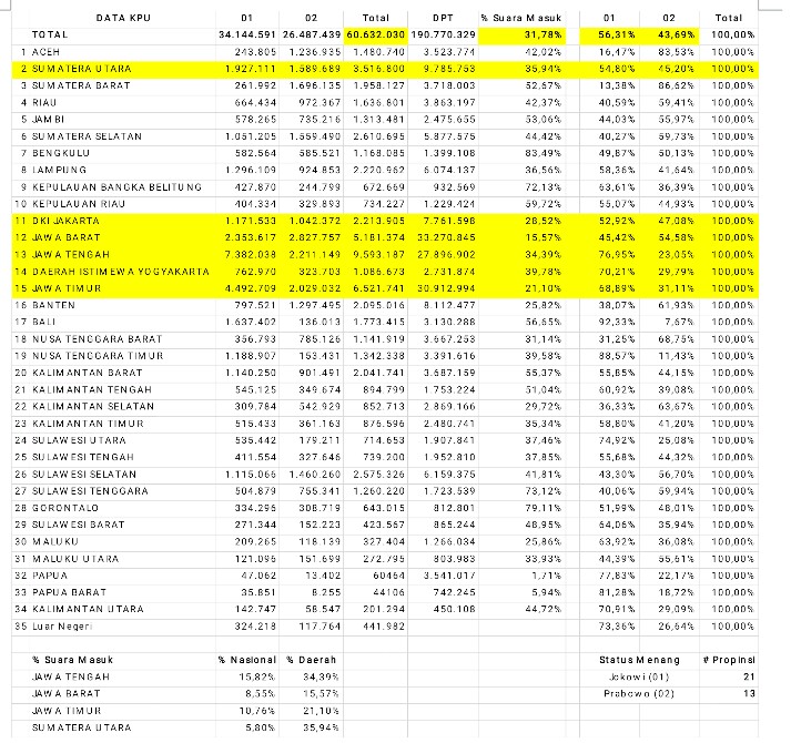 Input suara Jawa Tengah sudah mencapai 34,39 persen dengan perolehan suara 01 sebanyak 76,95 persen, sesuai arahan Quick Count. Untuk Sumatera Utara, data masuk sudah 35,94 persen, dengan perolehan suara 01 sebesar 54,8 persen.