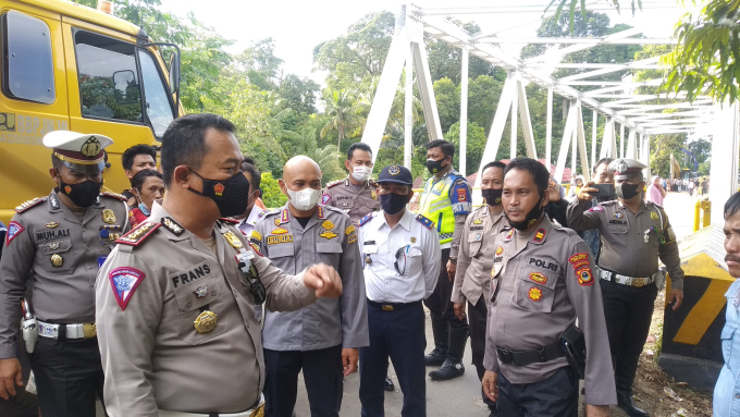 “Mohon bapak ibu, sebaiknya tidak usah lewat, kalau jembatan ambruk siapa yang mau bertanggung jawab,” kata Kombes Frans di hadapan warga.